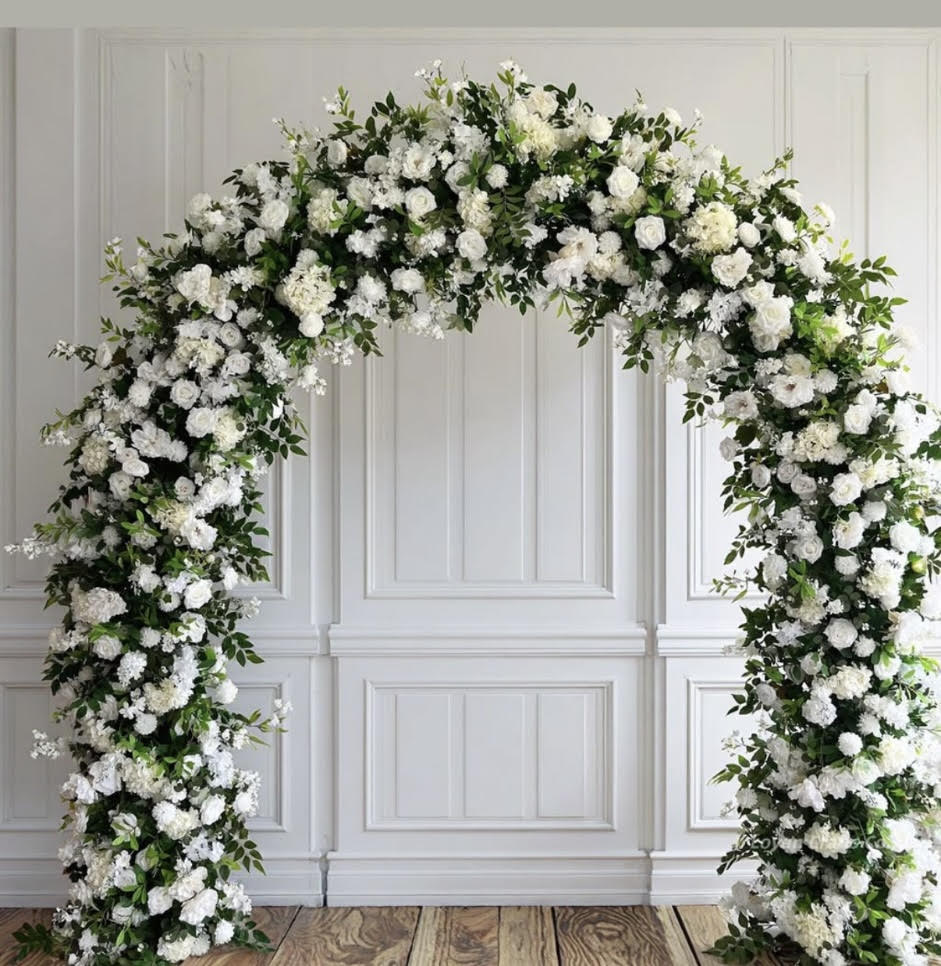 A beautifully crafted floral arch features lush white silk camellias and roses, thoughtfully accented with rich greenery for added depth and texture. This timeless design offers a soft romantic, and classic aesthetic—perfect for weddings, ceremonies, and elegant celebrations.